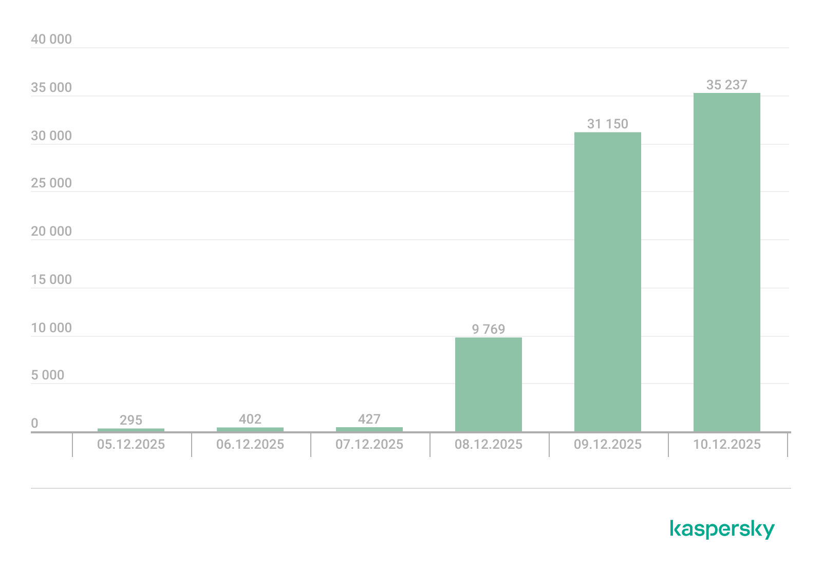 Первые попытки эксплуатации уязвимости были зафиксированы ханипотами Kaspersky 5 декабря, а в понедельник 8 декабря количество таких попыток кратно увеличилось и продолжает расти.