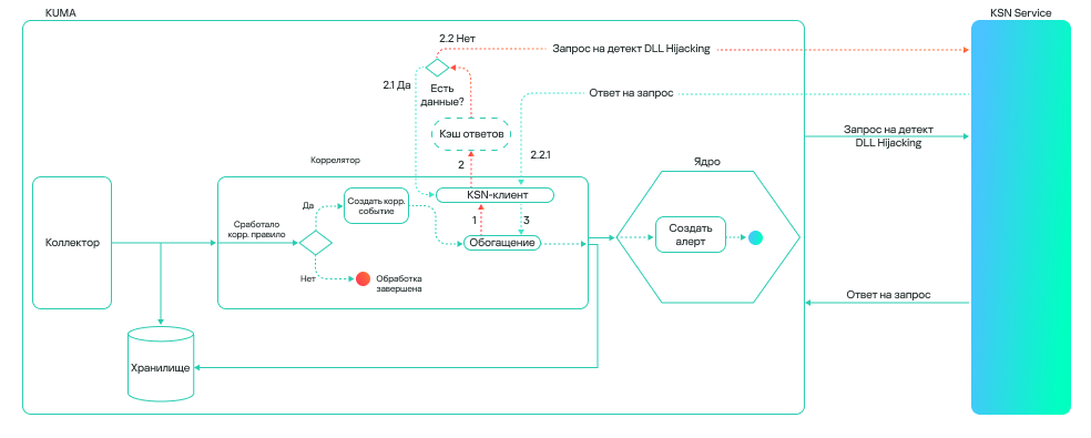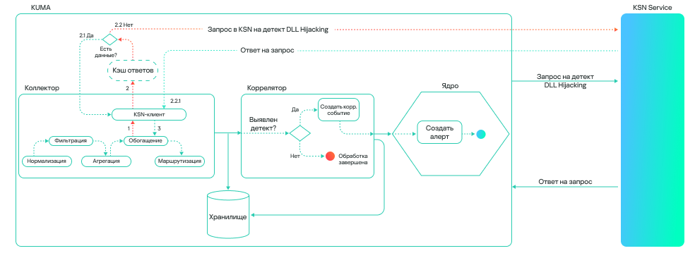 Модель может работать в одном из двух режимов: на корреляторе или на коллекторе. Коррелятор — это компонент SIEM, выполняющий анализ и сопоставление событий на основании заранее заданных правил или алгоритмов. Если детектирование настроено на корреляторе, модель проверяет события, на которые уже сработало какое-либо правило. Это уменьшает объем запросов в KSN и увеличивает скорость отклика модели.