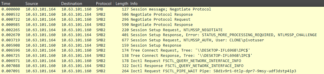 Для реализации коммуникации по протоколу SMB агенты кодируют и шифруют данные по схеме base64(UUID+AES256(JSON)), а затем разбивают их на блоки и передают по сети. На скриншоте ниже показано, как в Wireshark выглядит сетевая сессия процесса установки соединения между агентами.