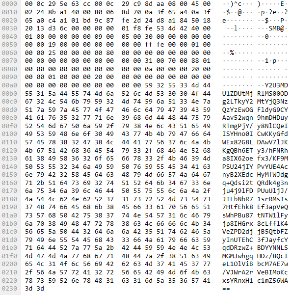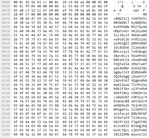 Схема кодирования данных также аналогична той, которую мы видели в коммуникации по протоколу SMB, и выглядит следующим образом: base64(UUID+AES256(JSON)). Ниже показан пример сетевого пакета с данными Mythic.