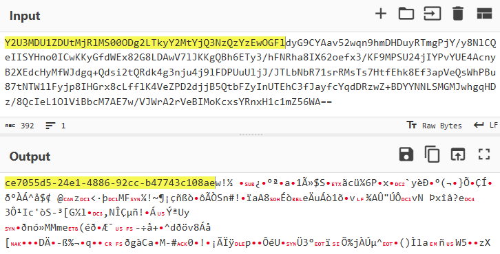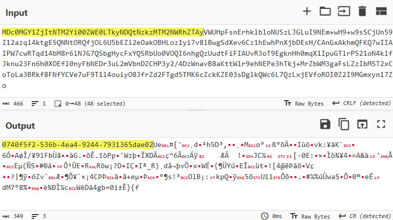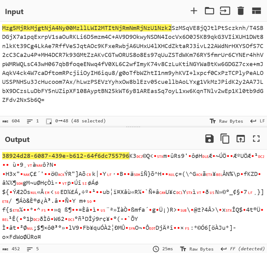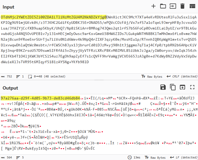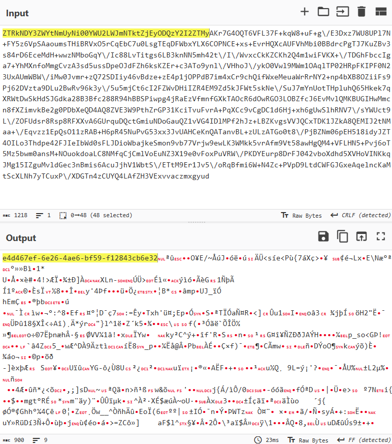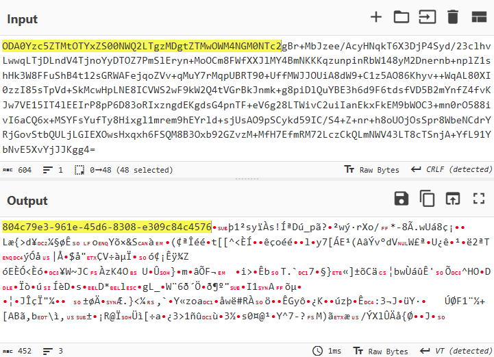 После расшифровки трафика и декодирования из base64 данные коммуникации представляют собой знакомую нам структуру UUID+AES256(JSON).