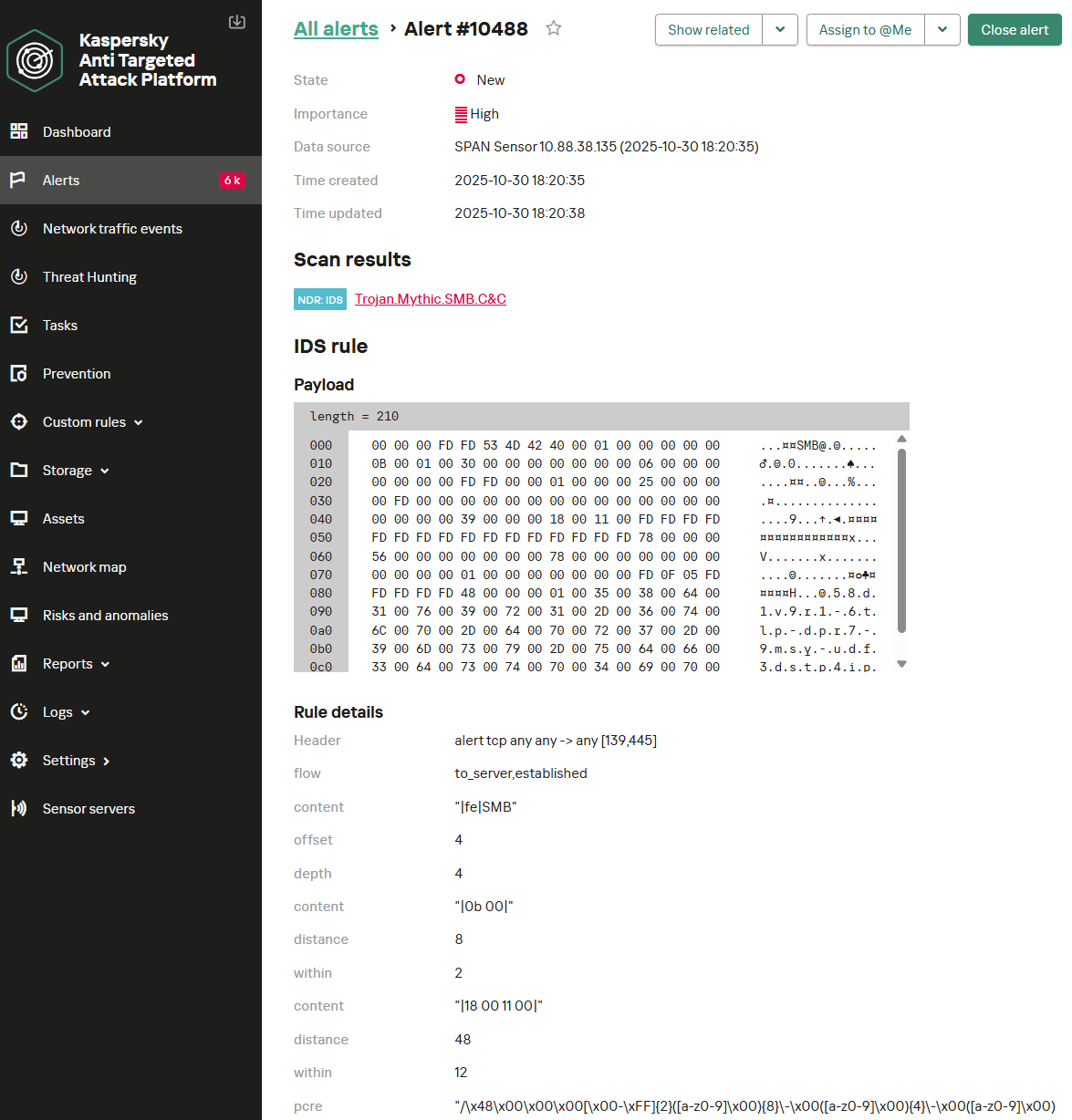 Ниже показан интерфейс KATA NDR c оповещением об обнаружении работы агента Mythic в режиме P2P по протоколу SMB. В данном случае сработало первое правило, проверяющее тип запроса, флаги протокола и шаблон UUID.
