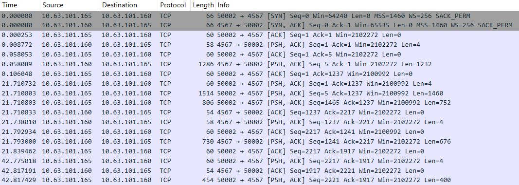 Mythic имеет возможность организации P2P-коммуникаций через протокол TCP. Процесс инициализации соединения в этом случае выглядит в сетевом трафике следующим образом.