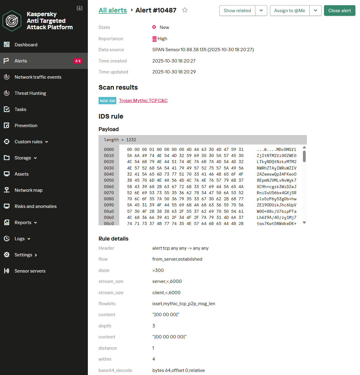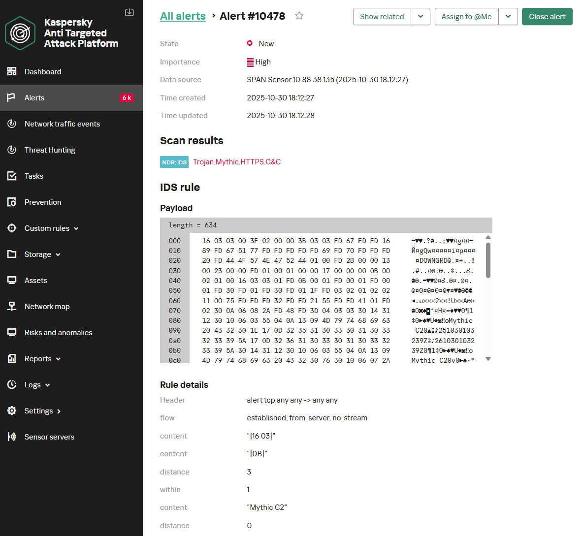 Mythic поддерживает достаточно много разных вариантов управления своими агентами, использующих ряд сетевых протоколов. Анализ коммуникаций агентов по этим протоколам показал, что их активность можно выявлять при помощи поиска данных в сетевом трафике по определенным шаблонам. Основной критерий обнаружения заключается в отслеживании строк UUID в определенных позициях передаваемых данных, закодированных по алгоритму base64. Однако, несмотря на то что в общем и целом подход к выявлению активности агентов одинаков для разных протоколов, для каждого из них используются и специфичные для него фильтры. Поэтому затруднительно сделать универсальную сигнатуру для выявления работы агентов Mythic в сетевом трафике: для каждого протокола требуется создавать индивидуальные правила обнаружения. В статье приведены сигнатуры, которые входят в состав Kaspersky NDR.