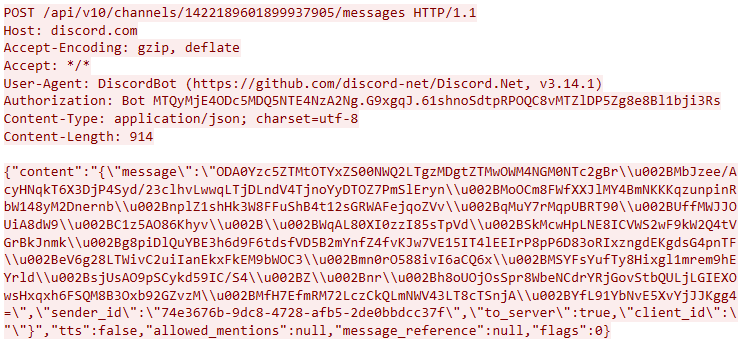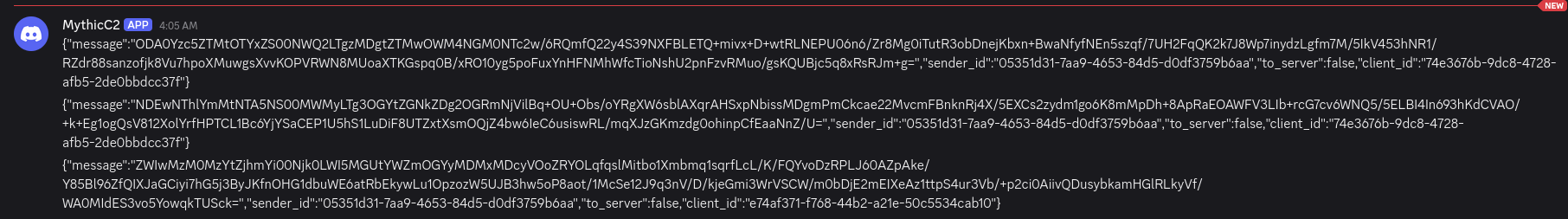 Здесь особый интерес для нас представляет поле message, содержащее передаваемые данные в закодированном в base64 виде. Сообщение вида MythicMessageWrapper передается в открытом виде, поэтому будет доступно любому, у кого есть разрешения на чтение сообщений на сервере Discord.
