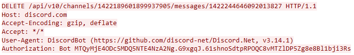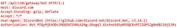 Для установления соединения агент аутентифицируется на сервере Discord при помощи API-вызова /api/v10/gateway/bot. В сетевом трафике мы видим при этом следующие данные.