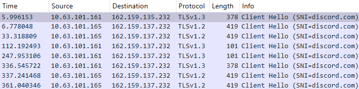 Если в сети разрешено использование Discord и нет возможности расшифровать трафик, то обнаружить работу агента практически нереально. В этом случае может помочь поведенческий анализ запросов к Discord-серверу. Ниже показан сетевой трафик, содержащий частые TLS-соединения с Discord-сервером, которые могут свидетельствовать об отправке команд агенту.