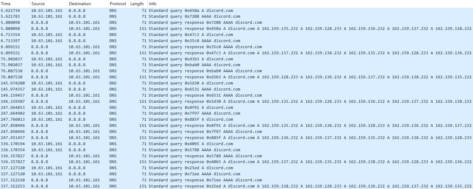 Еще один способ обнаружения таких коммуникаций заключается в отслеживании множественных DNS-запросов на домен discord.com.