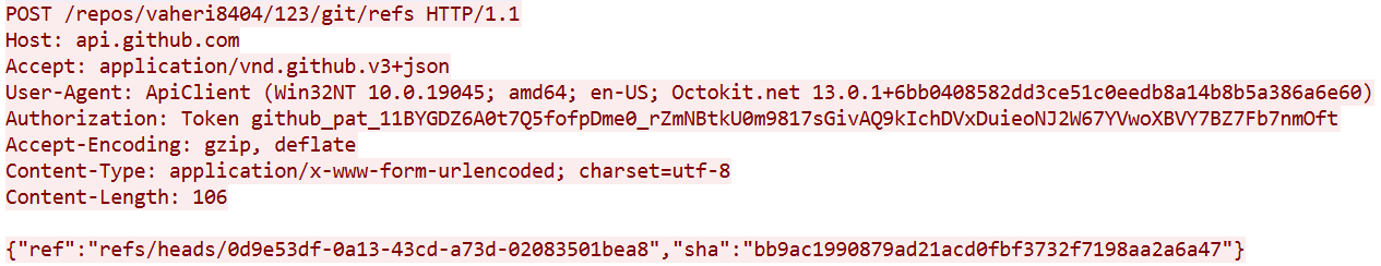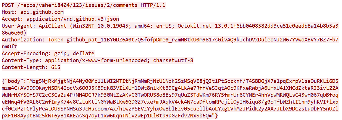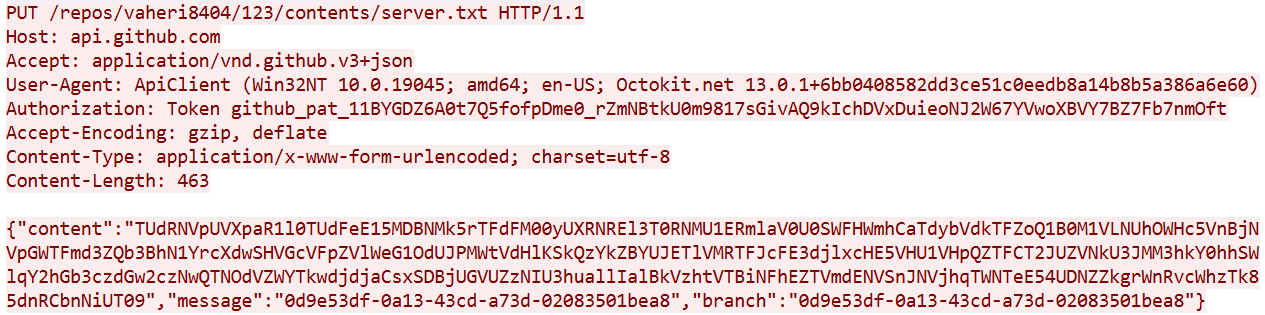 Коммуникация агента с сервером осуществляется при помощи API-вызовов к GitHub. Полезная нагрузка закодирована в base64, при этом она публикуется в открытом виде, поэтому любой, кто может просматривать репозиторий или анализировать содержимое трафика, в состоянии ее декодировать.