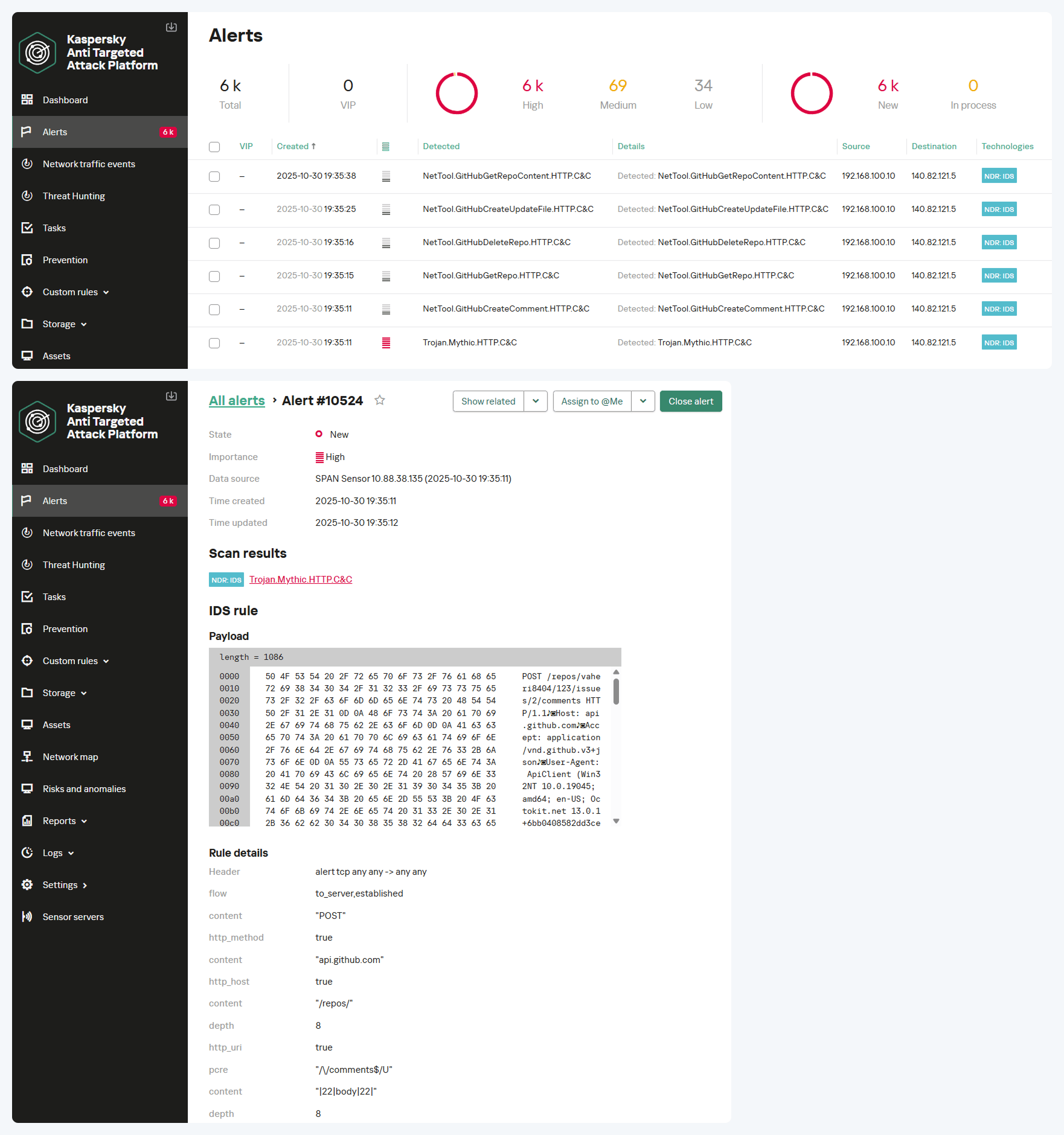 На скриншоте ниже показано, как NDR регистрирует все подозрительные коммуникации с использованием API GitHub, после чего выявляет работу агента Mythic. В результате создается оповещение с вердиктом Trojan.Mythic.HTTP.C&C.