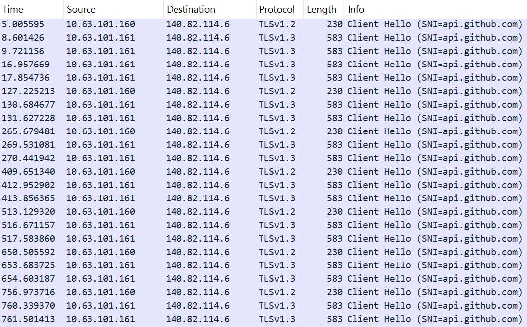 Например, можно выявлять нетипичные по частоте и назначению соединения с серверами GitHub из сетевых сегментов, где такие обращения не предусмотрены. На скриншоте ниже показан пример множественных TLS-сессий агента. В трафике отображено исполнение нескольких команд, а также простаивание, проявляющееся в постоянном опросе сервера в ожидании новых задач.
