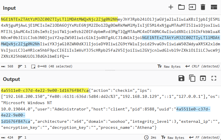 После декодирования можно увидеть UUID агента, который генерируется на основе определенного шаблона. За этим идентификатором следует JSON, в котором указаны основные параметры узла, собранные агентом.