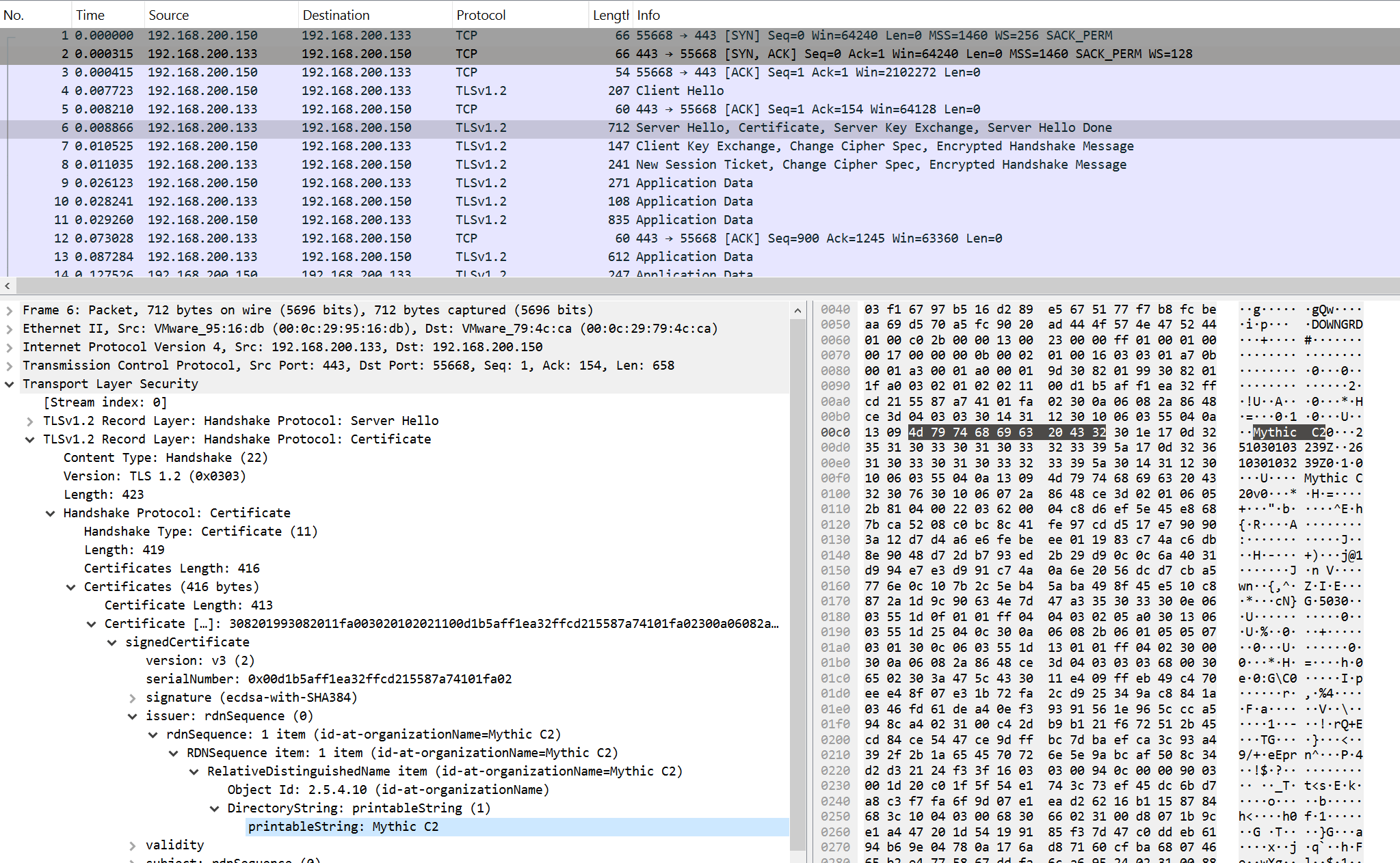 Агенты Mythic могут коммуницировать с сервером по протоколу HTTPS. Для этого используется соответствующий транспортный модуль. В этом случае данные зашифрованы при помощи TLS и не поддаются сигнатурному анализу. Однако активность агентов Mythic можно выявить, если они используют SSL-сертификат по умолчанию. Ниже показан пример сетевого трафика агента Mythic с таким сертификатом.