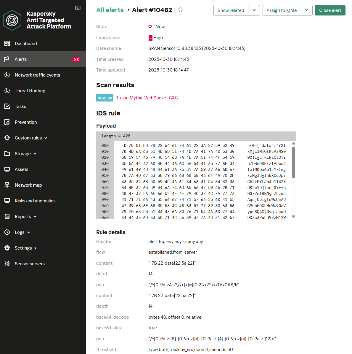 Ниже показано срабатывание сигнатуры Trojan.Mythic.WebSocket.C&C на коммуникации агента Mythic по протоколу WebSocket.
