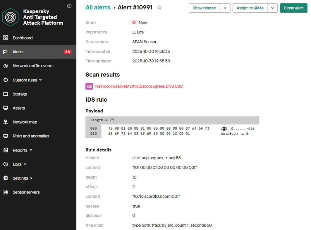 Ниже показан интерфейс NDR c примером работы одного из пользовательских правил, обнаруживающих работу транспортного модуля Discord C2 Profile агента Mythic в зашифрованном трафике по характерным запросам по протоколу DNS.