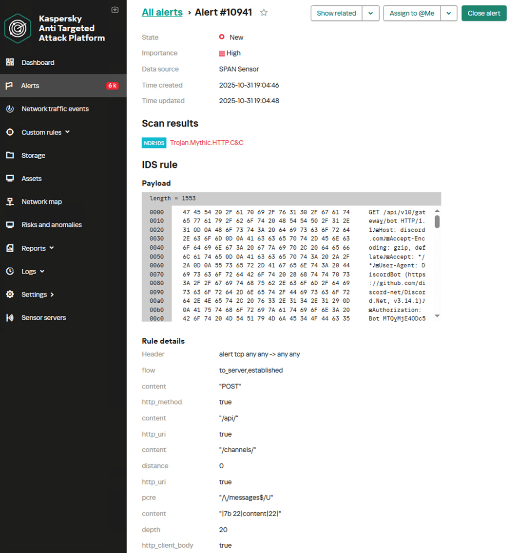 Ниже показан интерфейс NDR c примером обнаружения активности транспортного модуля Discord C2 Profile агента Mythic в расшифрованном HTTP-трафике.