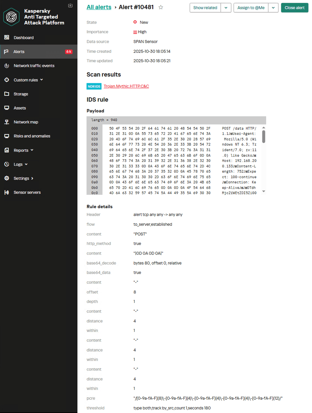 Ниже показано, как NDR обнаруживает коммуникацию агента с сервером по протоколу HTTP. При этом создается оповещение с именем Trojan.Mythic.HTTP.C&C.
