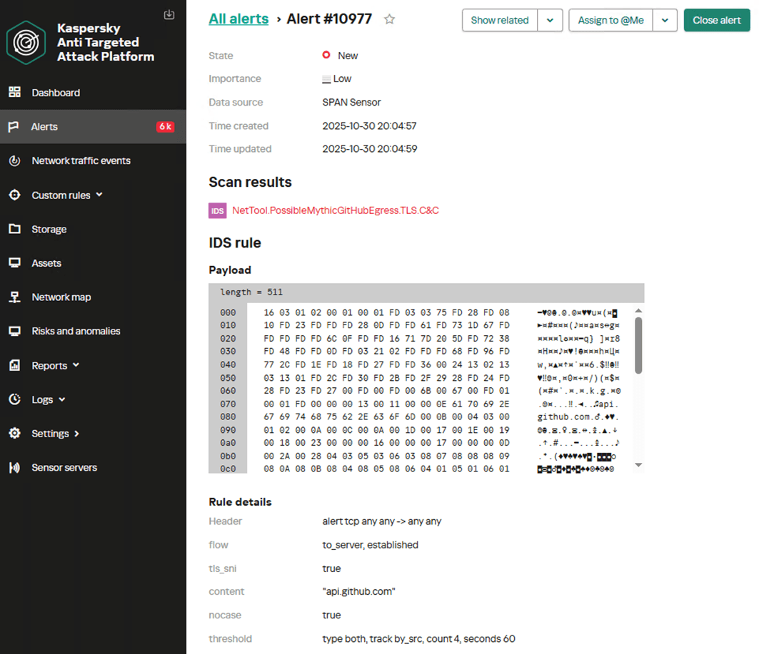 На скриншоте ниже показан интерфейс NDR c примером работы первого из приведенных правил, обнаруживающих в зашифрованном трафике следы активности GitHub-профиля агента Mythic по протоколу TLS.