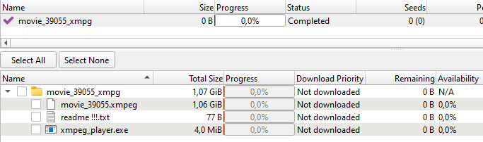 Торрент-файл загружает на устройство папку, содержащую нечто, похожее на фильм в формате .xmpeg, текстовый файлreadme !!!.txt и исполняемый файл, маскирующийся под проигрыватель.