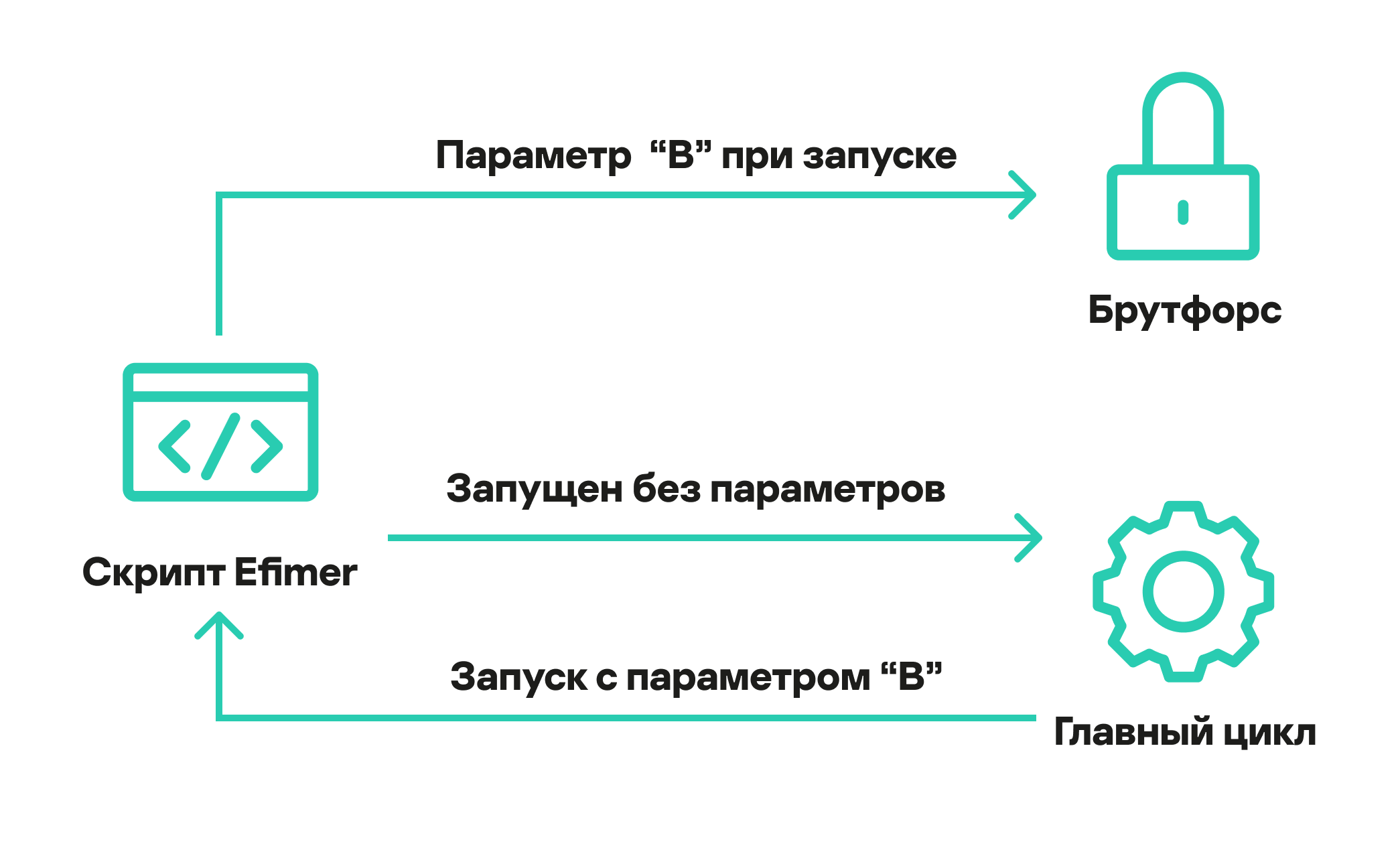Таким образом скрипт поддерживает два режима работы: брутфорс и главный, отвечающий за первый запуск скрипта. Если скрипт запущен без какого-либо параметра, то код перейдет сразу к главному циклу, из которого запустит сам себя уже с параметром B и приступит к брутфорс-атаке.