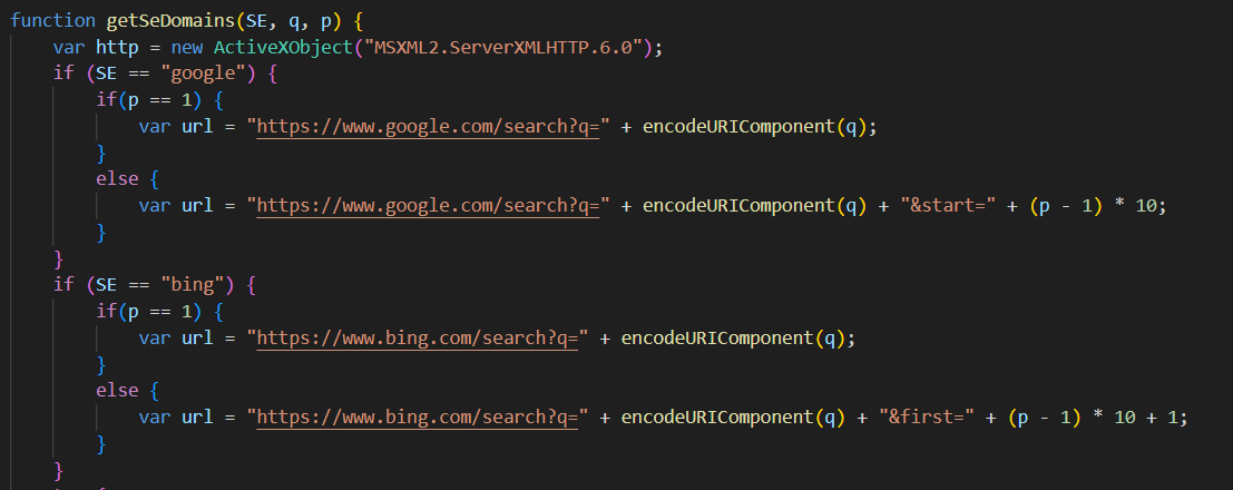 После этого он при помощи функции getSeDomains ищет в поисковых системах Google и Bing домены для брутфорса, передавая в поисковой параметр случайные слова из Википедии.