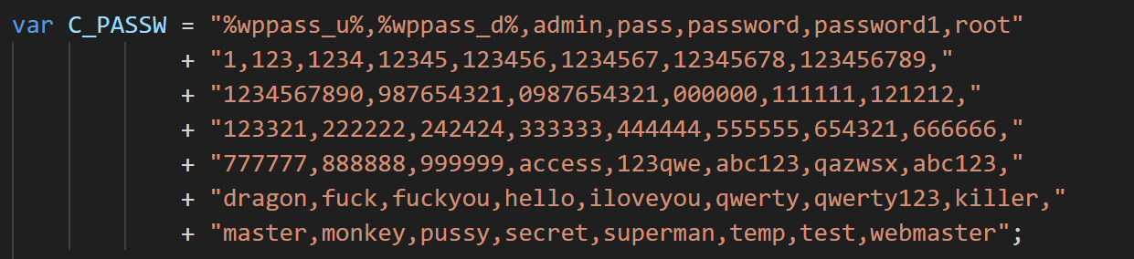 Среди дополнительных скриптов был файл с именем btdlg.js (MD5: 0f5404aa252f28c61b08390d52b7a054). Этот скрипт подбирает пароли для сайтов на WordPress.