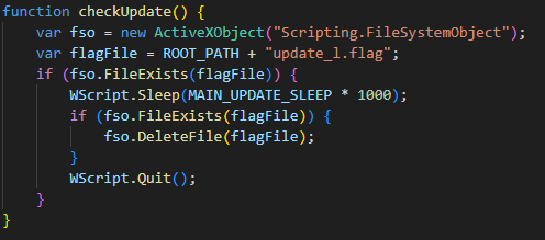 Далее запускается функция checkUpdate(), которая проверяет по пути C:\\Users\\Public\\Controller\\update_l.flag наличие файла. Если он существует, скрипт ожидает 30 секунд. Затем удаляет файл update_l.flag и завершает работу.