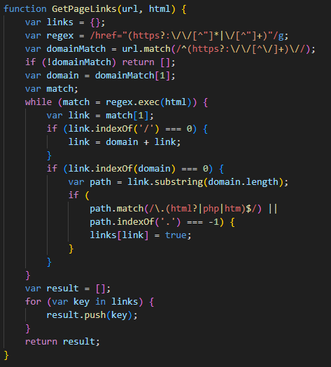 GetPageLinksанализирует HTML-контент веб-страницы и извлекает все ссылки, которые находятся на том же домене, что и исходная страница. Она фильтрует ссылки, оставляя только те, которые указывают на HTML/PHP-файлы или файлы без расширения.Функция