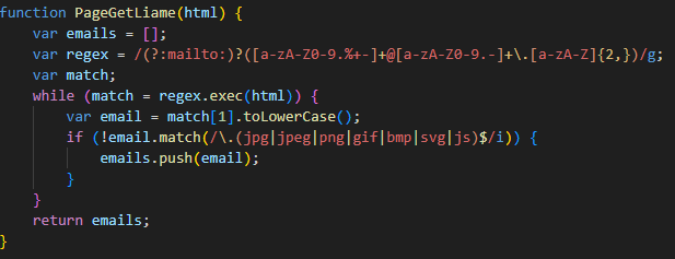 PageGetLiameизвлекает e-mail-адреса из HTML-контента страницы. Она поддерживает обработку как открытых адресов, так и тех, которые обернуты вmailto.Затем скрипт проходится по всем собранным ранее ссылкам на доменах, полученных от сервера, и оттуда также собирает e-mail-адреса. После этого из общего списка e-mail-адресов удаляются дублирующиеся, и скрипт сохраняет его для последующего использования.