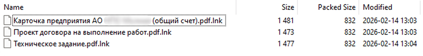 В феврале 2026 года хактивистская группировка Head Mare продолжает привлекать к себе внимание киберсообщества. Не успели мы рассказать о кампании с использованием PhantomHeart, как обнаружили еще одну масштабную фишинговую рассылку, на этот раз с новой версией бэкдора PhantomCore (PhantomDL). Получателям приходят письма от имени научно-исследовательской организации с предложением о заключении договора. Во вложениях находятся зашифрованные архивы, а в качестве пароля используется текущий год. В архиве — несколько файлов‑ярлыков (.lnk), которые автоматически запускают процесс загрузки и установки бэкдора.