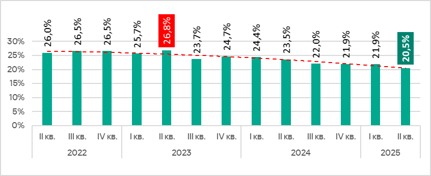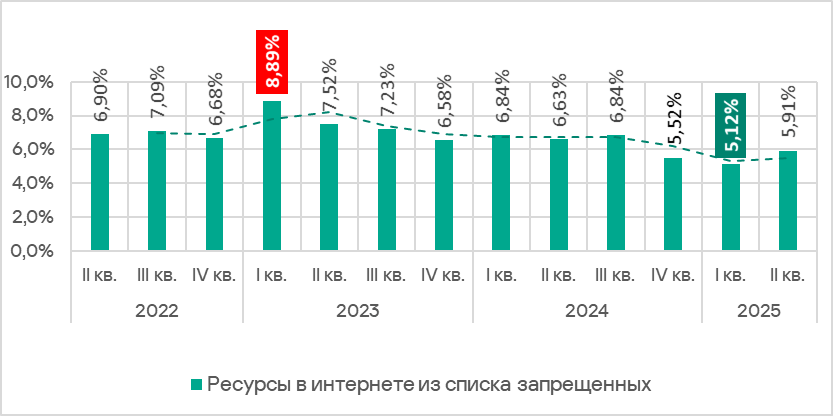 Доля компьютеров АСУ, на которых были заблокированы ресурсы в интернете из списка запрещенных, II квартал 2022 года — II квартал 2025 года