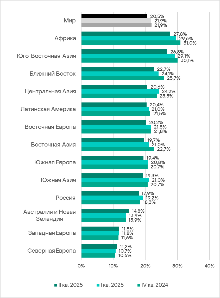 В регионах доля компьютеров АСУ, на которых во втором квартале 2025 года были заблокированы вредоносные объекты, варьируется от 11,2% в Северной Европе до 27,8% в Африке.