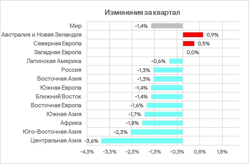 В большинстве регионов, рассматриваемых в этом отчете, показатель уменьшился по сравнению с предыдущим кварталом. Увеличился он только в Австралии и Новой Зеландии, а также в Северной Европе.